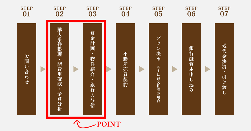 同時進行で進めていくイメージです。こういった契約を結ぶ前段階でいかに緻密に計画を立てられるかがご満足いただける不動産購入には不可欠です。そして、最善の結果に導くことこそが私たちの使命です。